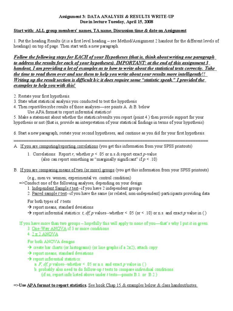2. Restate your first hypothesis. 3. State what statistical analysis you conducted to test the hypothesis 4. Then report/describe results of those analysessee points A. & B. below Use APA format to report inferential statistics! 5. Make a statement about whether the statistics/results you report (point 4.) then provide support for your hypothesis or not (that is, provide an interpretation of your statistical findings in terms of your hypothesis) 6. Start a new paragraph, restate your second hypotheses, and continue as you did for your first hypothesis. ============================================================================= A. If you are computing/reporting correlations (you get this information from your SPSS printouts) 1. Correlations: Report r, whether p < .05 or n.s.& report exact p-value (also can report something as marginally significant if p < .10) B. If you are comparing means of two (or more) groups (you get this information from your SPSS printouts) (e.g., men vs. women; experimental vs. control condition) =>Conduct one of the following analyses, depending on your design: 1. Independent Sample t test--if you have 2 independent groups 2. Paired sample t test--if you have the same (or related, non-independent) participants providing data For both types of t tests report means, standard deviations report inferential statistics: t, df, p values--whether < .05 (or < .10) or n.s. and exact p value in ( ) If you have more than two groups hopefully this will apply to none of youthats why I put it in green 3. One-Way ANOVA if 3 or more conditions 4. 2 x 2 ANOVA For both ANOVA designs create bar charts (or histograms) (or line graphs if a 2x2); attach copy report means, standard deviations report inferential statistics: a. F, df, p values--whether < .05 or n.s. and exact p value in ( ) b. probably also need to do follow-up t tests to compare individual conditions (if so, report info listed above under t testspoints B.1. or B.2.) =>Use APA format to report statistics. See book Chap 15 & examples below & class handout/notes.