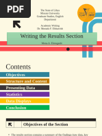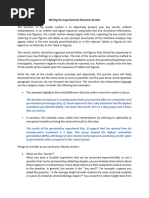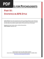 Writing up Test Results Remember to always remind the reader why you are doing what you are doing re-stating the hypothesis is typically enough. Then say how you tested the hypotheses (independent samples t test, paired samples t test, Pearson correlation coefficient, etc.). Then state what you found. Make sure that you make a statement about the direction of the effect (this is true no matter whether you are reporting correlations or t tests or both). Particularly for correlations that is important when it isnt necessarily clear in what direction you scored your variables. Report the actual statistics (see OHs from Chapter 15, examples below, textbook, and assignment). Make sure that somewhere here you make an explicit statement as to whether your findings are statistically significant or not. Draw some conclusion about whether these results are consistent with and supportive of your hypothesis or not. Restate your hypothesis (We hypothesized that) State what test you did to test your hypothesis (To test this hypothesis we conducted an independent samples t test State what the results were (Results suggested...) Comment briefly on the results, leaving most commentary for the discussion (These results indicate no significant relationship between x and y in this sample) Make sure that the order of your hypotheses as introduced in the introduction is consistent with your result section and, generally, with your discussion. Information to Include in Reporting Test Statistics (the numbers themselves) Mean differences (t, F, and chi-square tests). For t tests (F tests, anc chi-squares tests), include the numerical value obtained for the statistic, degrees of freedom, and probability level (state whether less than .05 or .10, marginally significant and then provide exact probability). See OHs and Assignment. You MUST report actual means and standard deviations whenever you report that means differed. These may be provided in a table but, again, as we discussed in class and see OHs for class, only use tables if you have a lot of information to summarize. Correlations. For correlations, provide the actual correlation and probability level (state whether less than .05 or .10, marginally significant and then provide exact probability). See OHs and Assignment. All results. For all results (correlations and mean differences), indicate the direction of effect; for example, the anxiety group scored significantly higher than the control group is better than the scores of the two groups were significantly different. Oftentimes it might be easier not to try and put the information about the direction of the effect and the actual statistical information in the same sentence. So, you could provide a statement about the direction of effects and then follow this info with the actual t-test results. For correlational results, b/c there is less information to provide, it might be easy enough to provide the statistical information and directional information in the same sentence. See examples below as to how to talk about your results. No matter what, ask someone else to read over what you write (a friend) and see if they know what it means. REMEMBER: do not call findings that did not reach conventional statistical significance INsignificant they are simply nonsignificant in terms of the particular level of significance you chose to evaluate your findings at (should be p < .05 for this class)