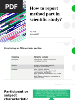 --------------------------------------------------------------------------------------------------------------------------------------C. Other analyses you need to conduct although these statistics should be reported in the Method section => However, you will report the results of these analyses in the Method section rather than the Result section. Look back at the example write-up of a Method section I included in assignment 2; for example, it will tell you how to report information about your scale scores and alpha reliability analyses and participants; I do not provide a section for Outlier analyses but you all should have a final paragraph in your Method section that says what you did to check for outliers and what you found even if you say that you did not find any outliers.) => So, we suggest that you hand in a complete revised Method sectionor at the very least, provide parts of the Method section that have the following information in them: 1. Participants: report percentages of gender & ethnicity; mean & range for age; any other statistics about your Ps you measured and you feel are important to provide 2. Measures: for each major measure (construct), report means, standard deviations; if multiple items, report # of items & Alpha reliability (report in same section in which you describe the measure/items, etc.) 3. Any other reliability information (e.g. inter-rater) should go into the Method section as well. Only information that tests the hypothesized relations should be reported in the Results section. 4. Outliers: How did you check for outliers (e.g., look at descriptive statistics are min, max what you expect? Maybe compute z-scores for key variables & also look at scatterplots if you are running correlations)? Did you find any? Say if you did not; if you did, ecide what to do with them & describe in Method section).