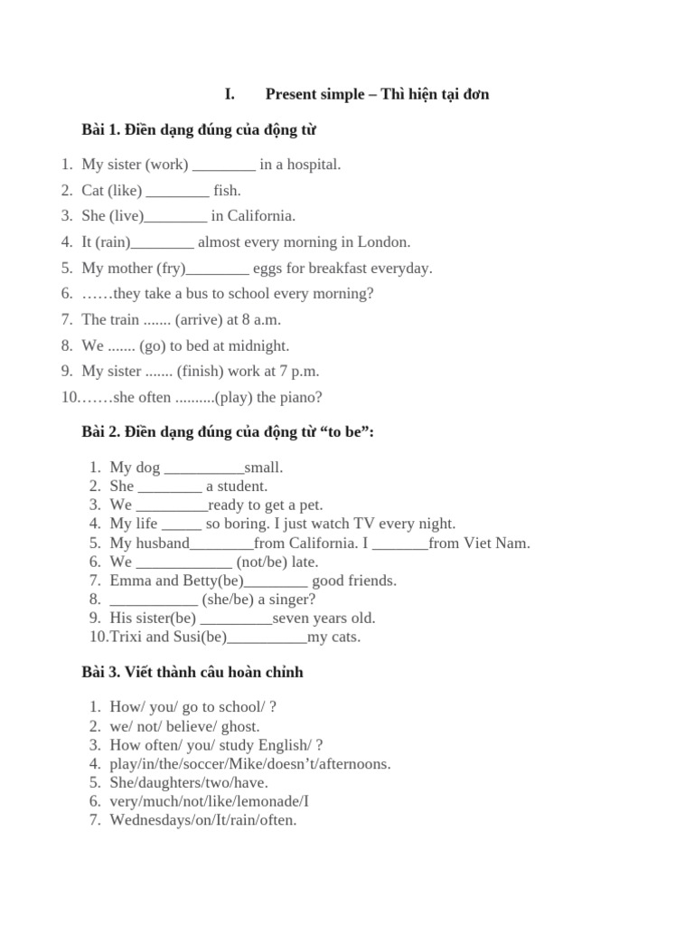 Bài 1. Cho dạng đúng của động từ trong ngoặc ở thì hiện tại đơn hoặc hiện tại