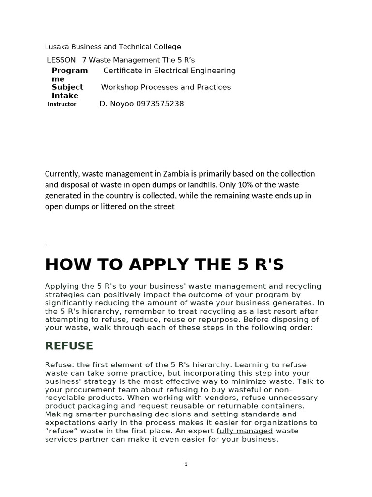 LESSON 7 Waste Management The 5 R’s