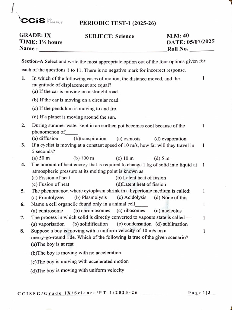 GRADE: IX SUBJECT: Science M.M: 40
