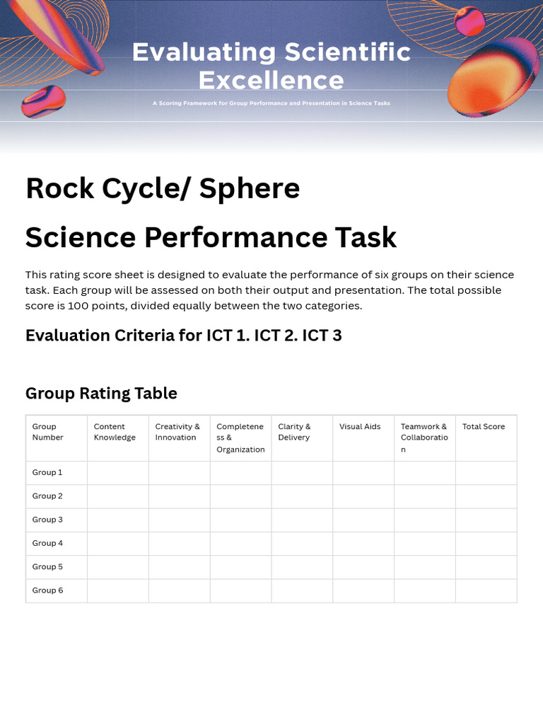 This rating score sheet is designed to evaluate the performance of six groups on their science