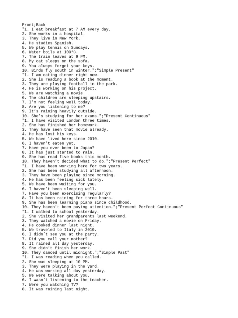10. She’s studying for her exams.";"Present Continuous"