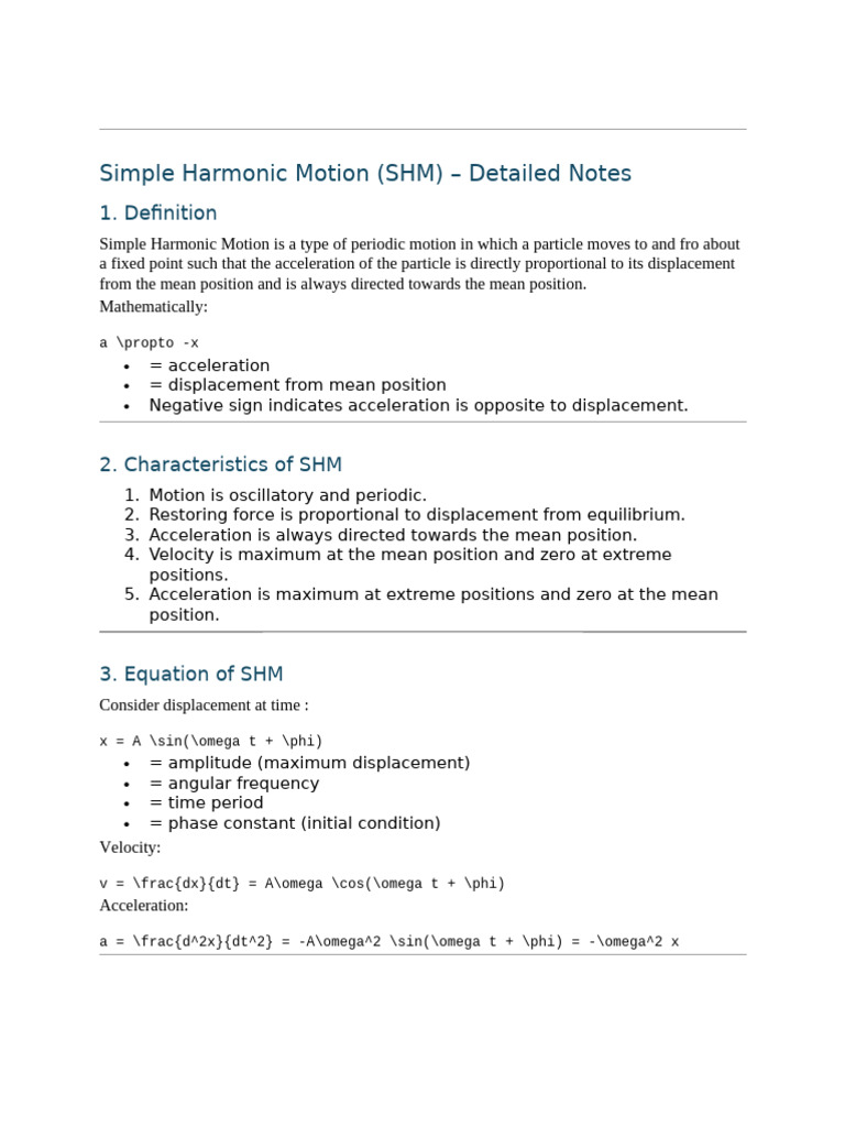 Simple Harmonic Motion (SHM) – Detailed Notes