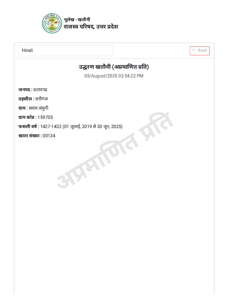 उद्धरण खतौनी (अप्रमाणित प्रति)