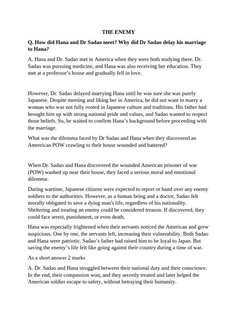 Q. How did Hana and Dr Sadao meet? Why did Dr Sadao delay his marriage