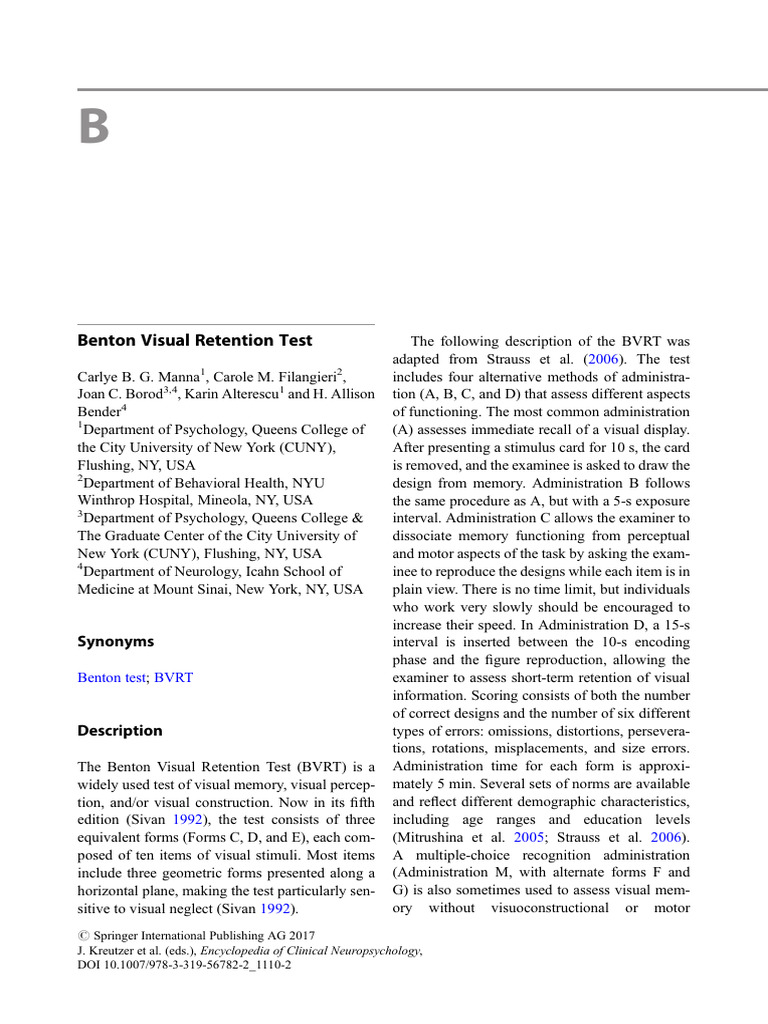 The Benton Visual Retention Test (BVRT) is a Administration time for each form is approxi-