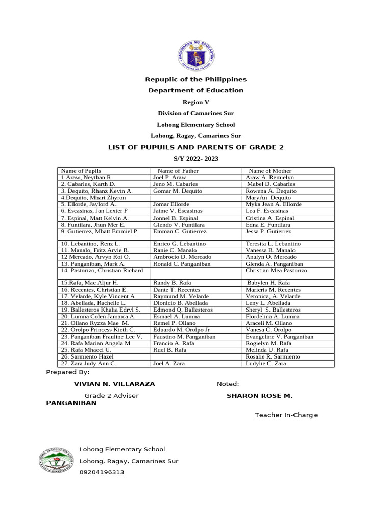 LIST OF PUPUILS AND PARENTS OF GRADE 2