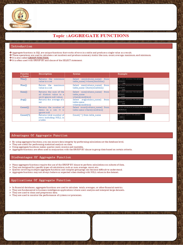 Applications Of Aggregate Function