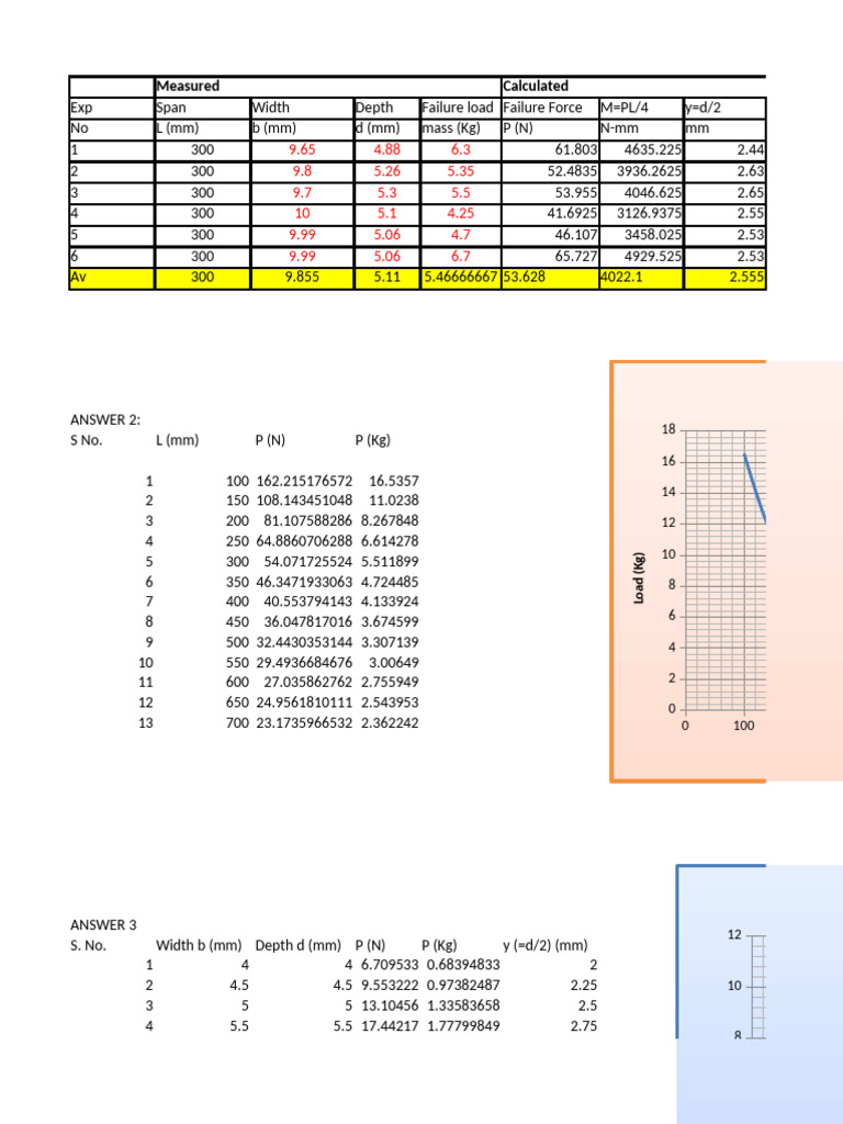 S. No. Width b (mm) Depth d (mm) P (N) P (Kg) y (=d/2) (mm)