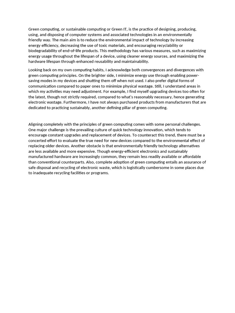 Green computing, or sustainable computing or Green IT, is the practice of designing, producing,