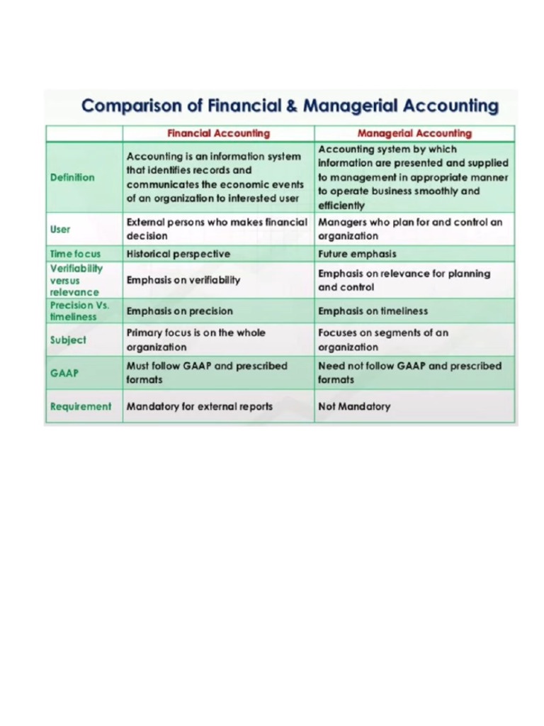 The document compares financial and managerial accounting, highlighting that financial accounting focuses on external reporting and must adhere to GAAP, while managerial accounting emphasizes internal planning and control without strict format requirements. It outlines key accounting concepts such as assets, liabilities, equity, revenue, and expenses, along with various financial statements and accounting ratios. Additionally, it includes rules of debit and credit, illustrating the classification of accounts and their normal balances.