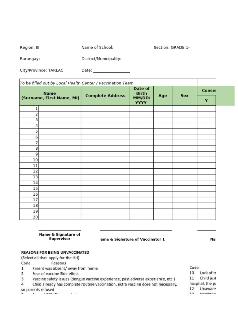 Supervisor Name & Signature of Vaccinator 1 Name & Signa