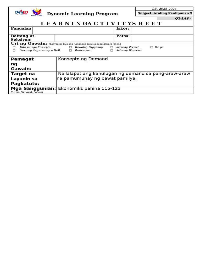 Dynamic Learning Program Subject: Araling Panlipunan 9