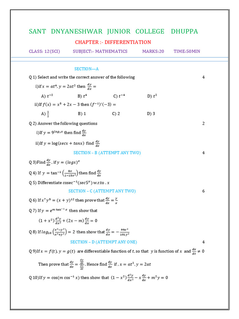 CLASS: 12(SCI) SUBJECT:- MATHEMATICS MARKS:20 TIME:50MIN