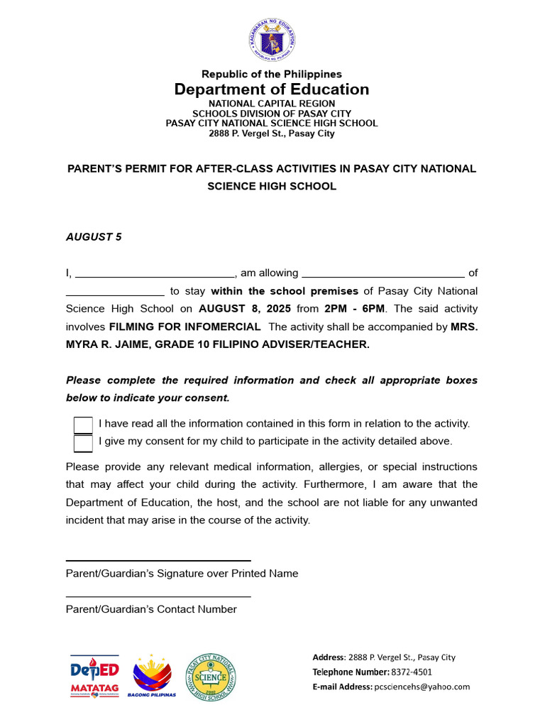 PARENT’S PERMIT FOR AFTER-CLASS ACTIVITIES IN PASAY CITY NATIONAL