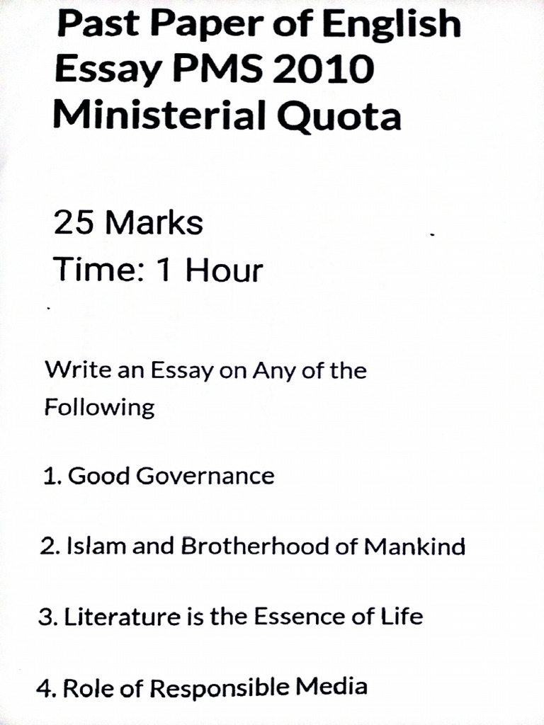 The document outlines various essay topics for the Provincial Management Service (PMS) examinations conducted by the Punjab Public Service Commission from 2010 to 2021. Each examination allows candidates to choose one topic to write an essay on, with a maximum time of one hour and a total of 25 marks. Topics range from governance and environmental issues to education and social media impacts.