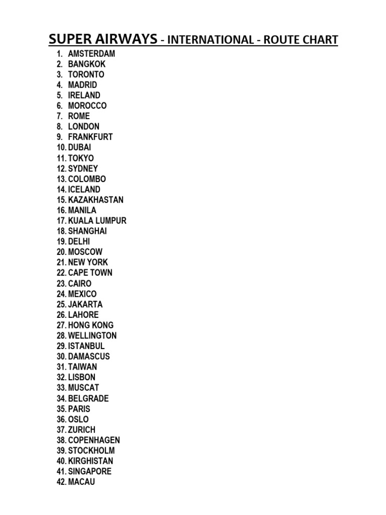 SUPER AIRWAYS - INTERNATIONAL - ROUTE CHART