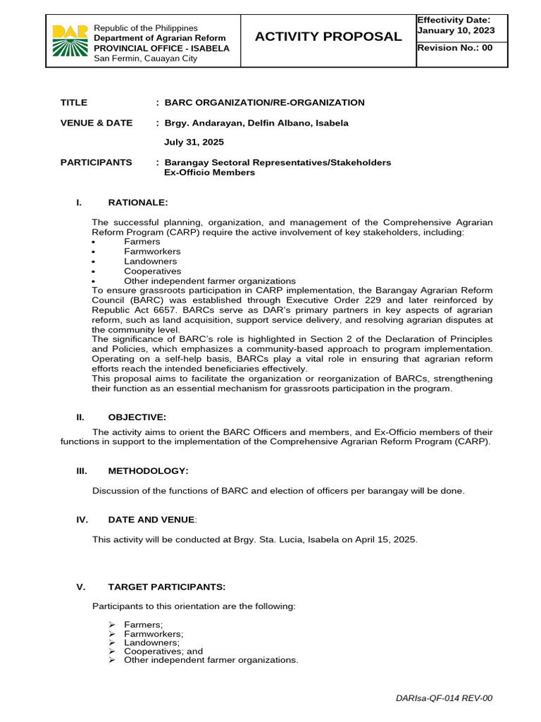 Department of Agrarian Reform ACTIVITY PROPOSAL