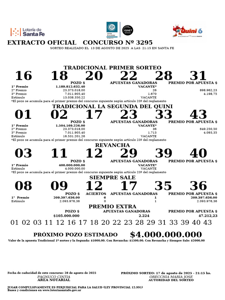 SORTEO REALIZADO EL 13 DE AGOSTO DE 2025 A LAS 21:15 EN SANTA FE