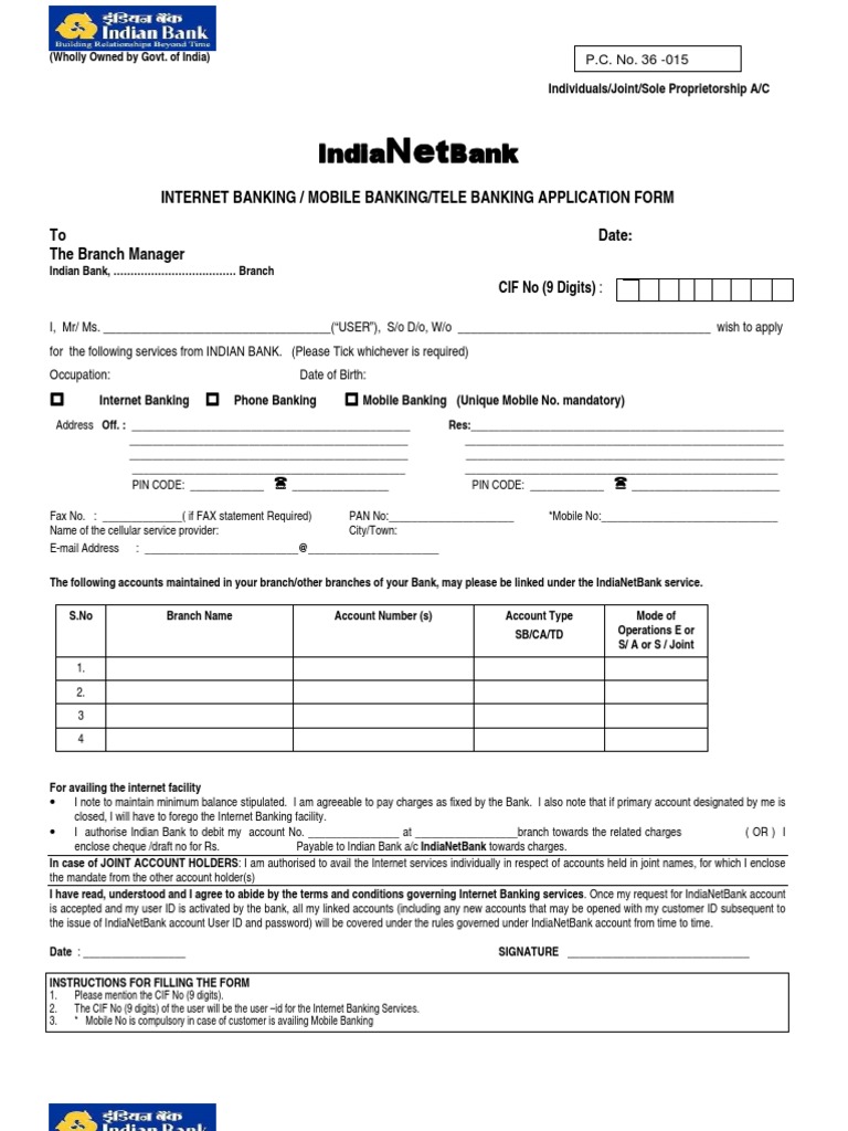 For availing the internet facility I note to maintain minimum balance stipulated. I am agreeable to pay charges as fixed by the Bank. I also note that if primary account designated by me is closed, I will have to forego the Internet Banking facility. I authorise Indian Bank to debit my account No. ________________ at __________________branch towards the related charges ( OR ) I enclose cheque /draft no for Rs. Payable to Indian Bank a/c IndiaNetBank towards charges. In case of JOINT ACCOUNT HOLDERS: I am authorised to avail the Internet services individually in respect of accounts held in joint names, for which I enclose the mandate from the other account holder(s) I have read, understood and I agree to abide by the terms and conditions governing Internet Banking services. Once my request for IndiaNetBank account is accepted and my user ID is activated by the bank, all my linked accounts (including any new accounts that may be opened with my customer ID subsequent to the issue of IndiaNetBank account User ID and password) will be covered under the rules governed under IndiaNetBank account from time to time. Date : __________________ INSTRUCTIONS FOR FILLING THE FORM