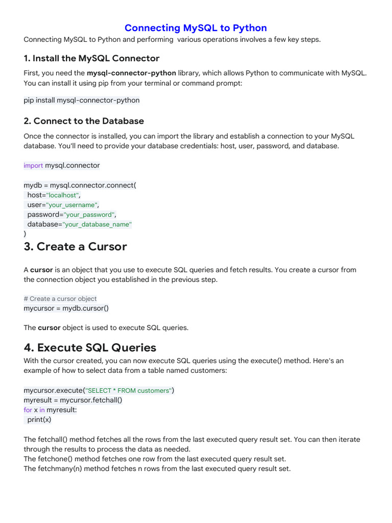 Connecting MySQL to Python and performing various operations involves a few key steps.