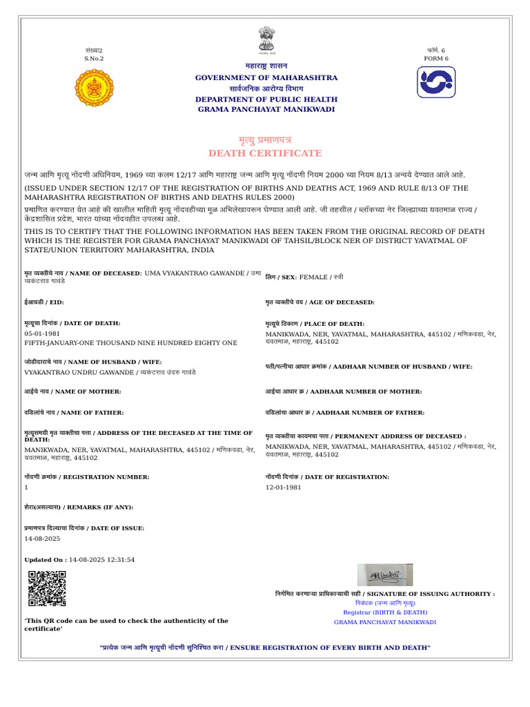 मािणत कर यात येत आहे की खालील मािहती मृ यू न दवही या मूळ अिभलेखाव न घे यात आली आहे . जी तहसील / लॉक या नेर िज ा या यवतमाळ रा य /