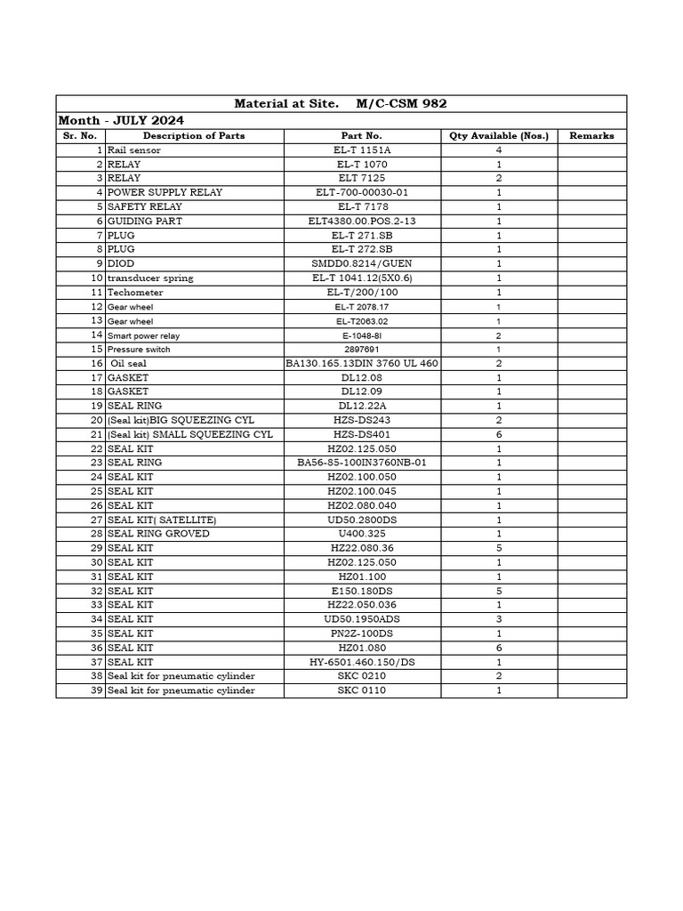 Sr. No. Description of Parts Part No. Qty Available (Nos.) Remarks