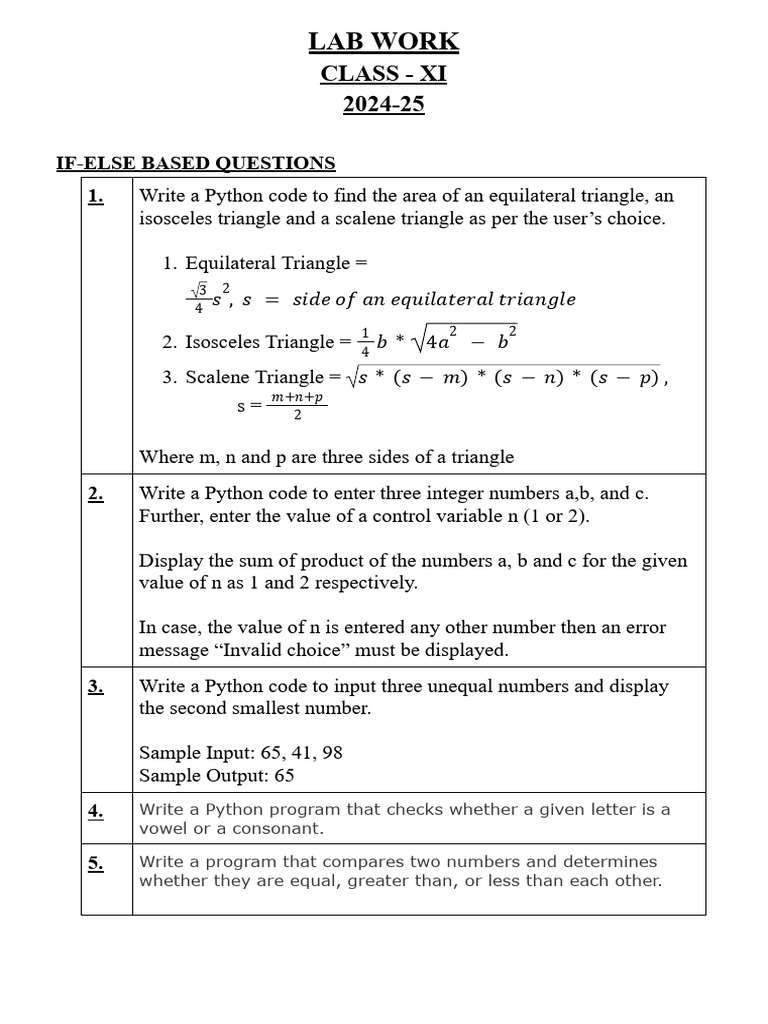 1. rite a Python code to find the area of an equilateral triangle, an