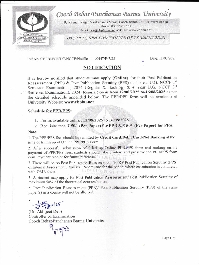 R.aassessrnent (PPR) & Post Publication Scrutiny (PPS) of 4 Year U.G. NCCF 1't