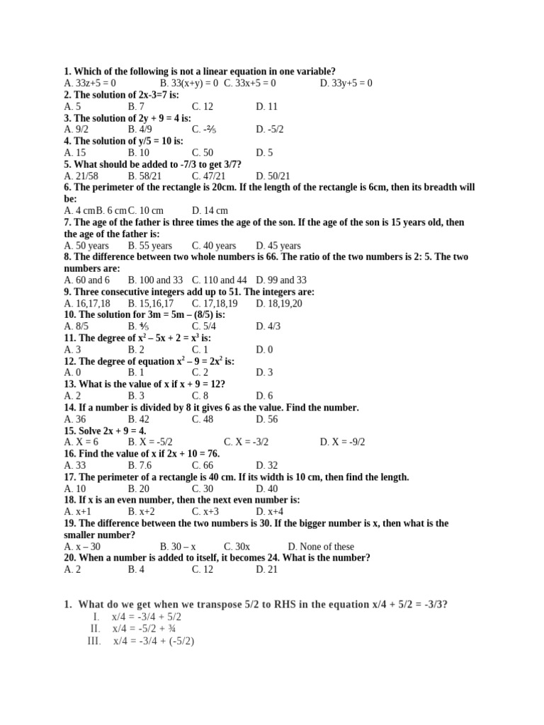 1. Which of the following is not a linear equation in one variable?