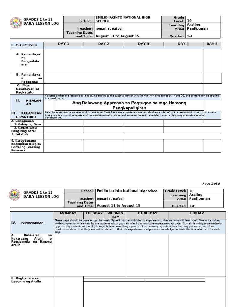 GRADES 1 to 12 School: Emilio Jacinto National Highschool Level: 10