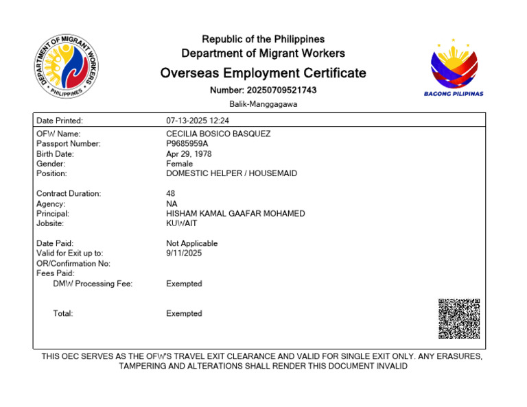 THIS OEC SERVES AS THE OFW'S TRAVEL EXIT CLEARANCE AND VALID FOR SINGLE EXIT ONLY. ANY ERASURES,