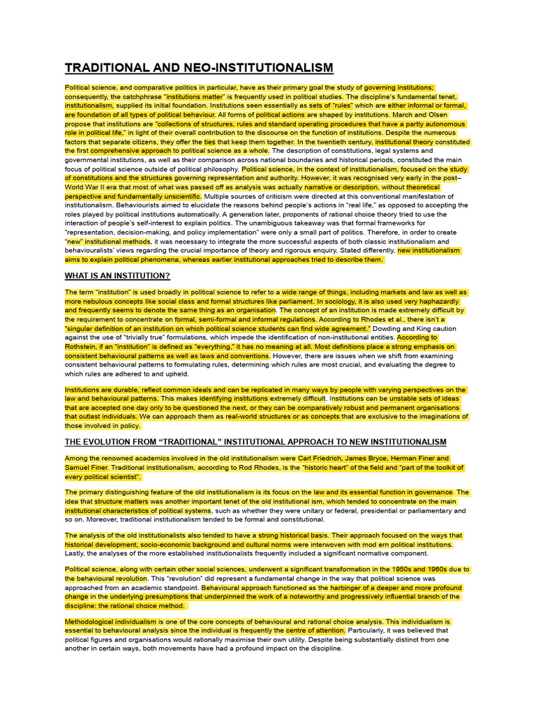 so on. Moreover, traditional institutionalism tended to be formal and constitutional.