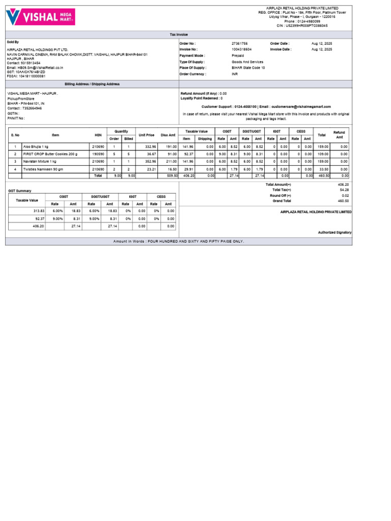 Email: HB09.Sm@VishalRetail.co.in Place Of Supply : BIHAR State Code 10