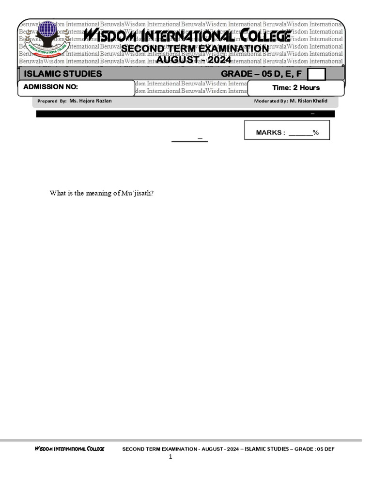 Wisdom International College SECOND TERM EXAMINATION - AUGUST - 2024 – ISLAMIC STUDIES – GRADE : 05 DEF