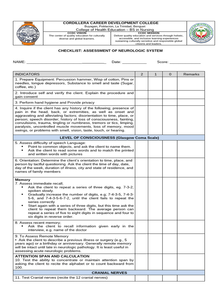 CHECKLIST: ASSESSMENT OF NEUROLOGIC SYSTEM