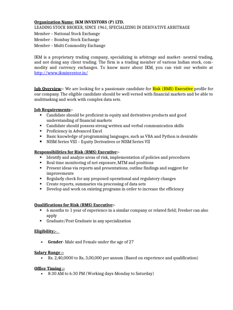 Job Overview:- We are looking for a passionate candidate for Risk (RMS) Executive profile for