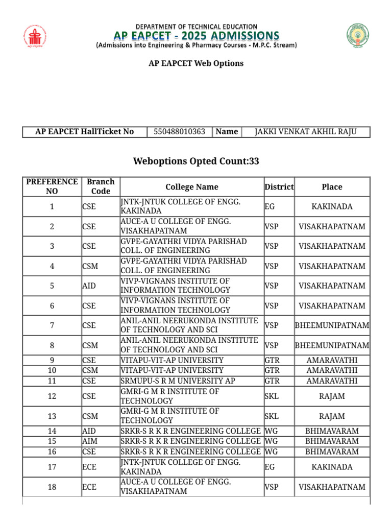 AP EAPCET HallTicket No 550488010363 Name JAKKI VENKAT AKHIL RAJU