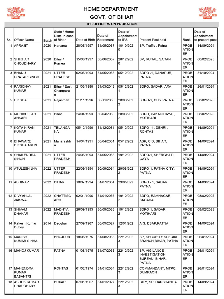 16 MANOJ KUMAR PATNA 01/08/1975 31/07/2035 22/12/202 SP, VIGILANCE PROB 26/01/2024