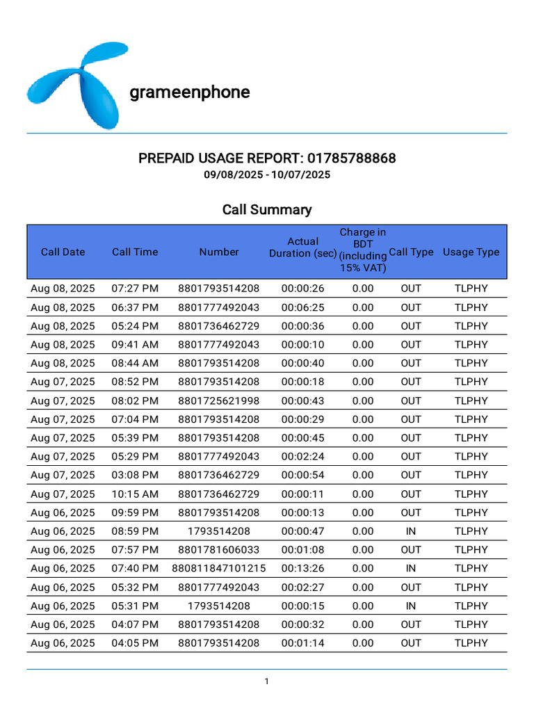 Aug 06, 2025 07:57 PM 8801781606033 00:01:08 0.00 OUT TLPHY