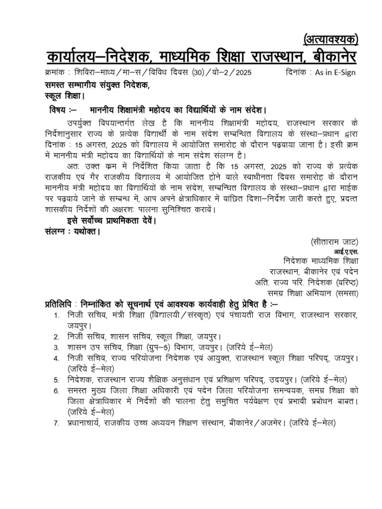 vr% mDr dze esa funsZf’kr fd;k tkrk gS fd 15 vxLr] 2025 dks jkT; ds çR;sd