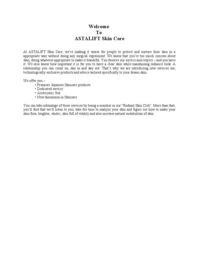 At ASTALIFT Skin Care, were making it easier for people to protect and nurture their skin in a appropriate way without doing any surgical experiment. We know that youre too much concern about skin, doing whatever appropriate to make it beautiful. You deserve our service and respect and you have it. We also know how important it is for you to have a clear skin while maintaining radiance look. A relationship you can count on, day in and day out. Thats why we are introducing new services era, technologically exclusive products and advice tailored specifically to your dream skin. We offer you Premiere Japanese Skincare products Dedicated service Aristocratic feel New dimension in Skincare You can take advantage of these services by being a member in our Radiant Skin Club. More than that, youll find that well listen to you, take the time to analyze your skin and figure out how to make your skin firm, brighter, elastic, skin full of vitality and also increase natural metabolism of skin.