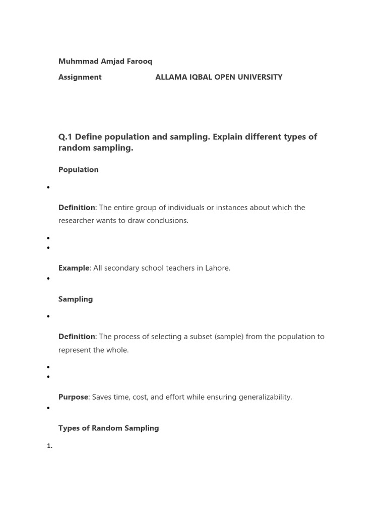 Q.1 Define population and sampling. Explain different types of