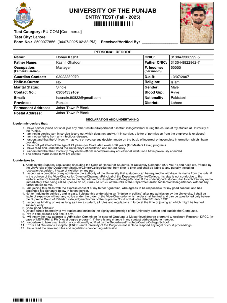 Father Name: Kashif Ghafoor Father CNIC: 31304-8922962-7
