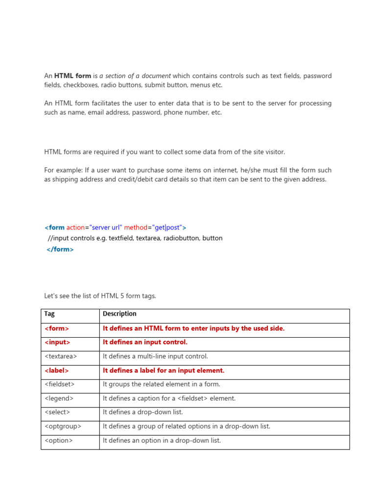 An HTML form facilitates the user to enter data that is to be sent to the server for processing