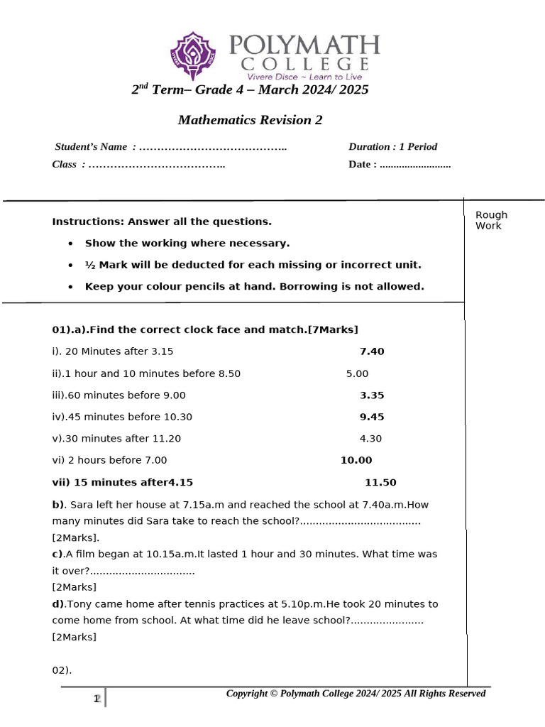 2nd Term Revision– March 2024/ 2025 Grade 4 Mathematics