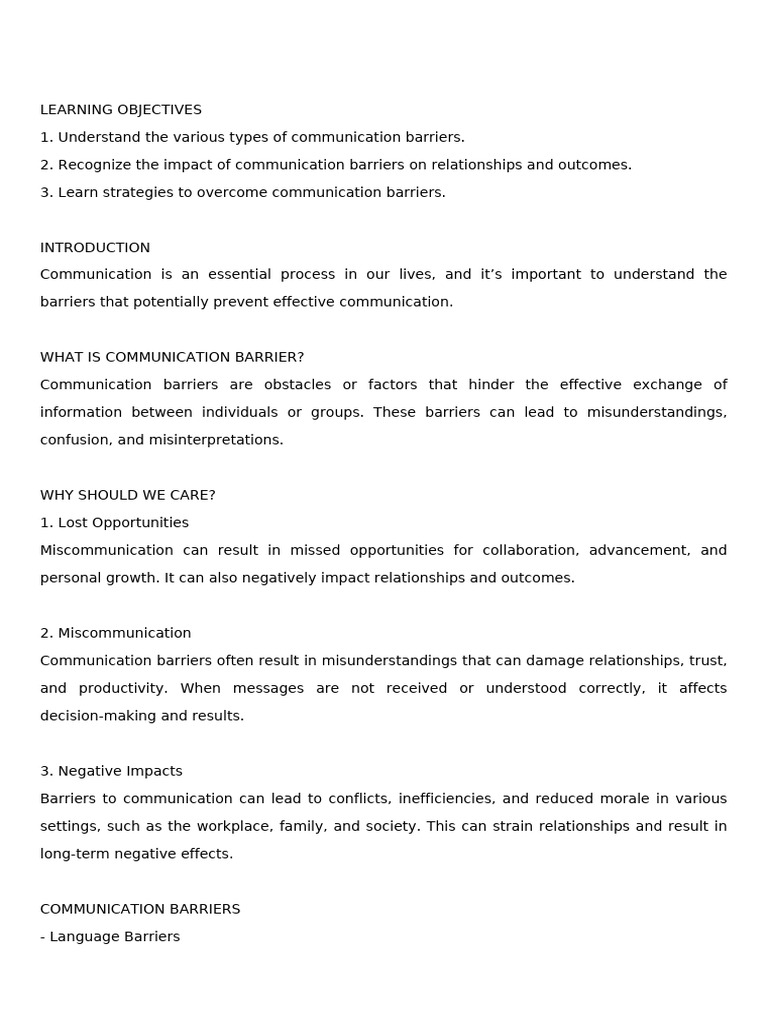 information between individuals or groups. These barriers can lead to misunderstandings,