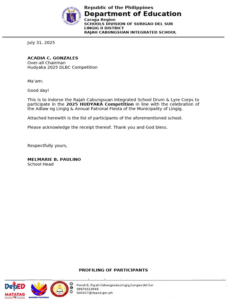 This is to indorse the Rajah Cabungsuan Integrated School Drum & Lyre Corps to
